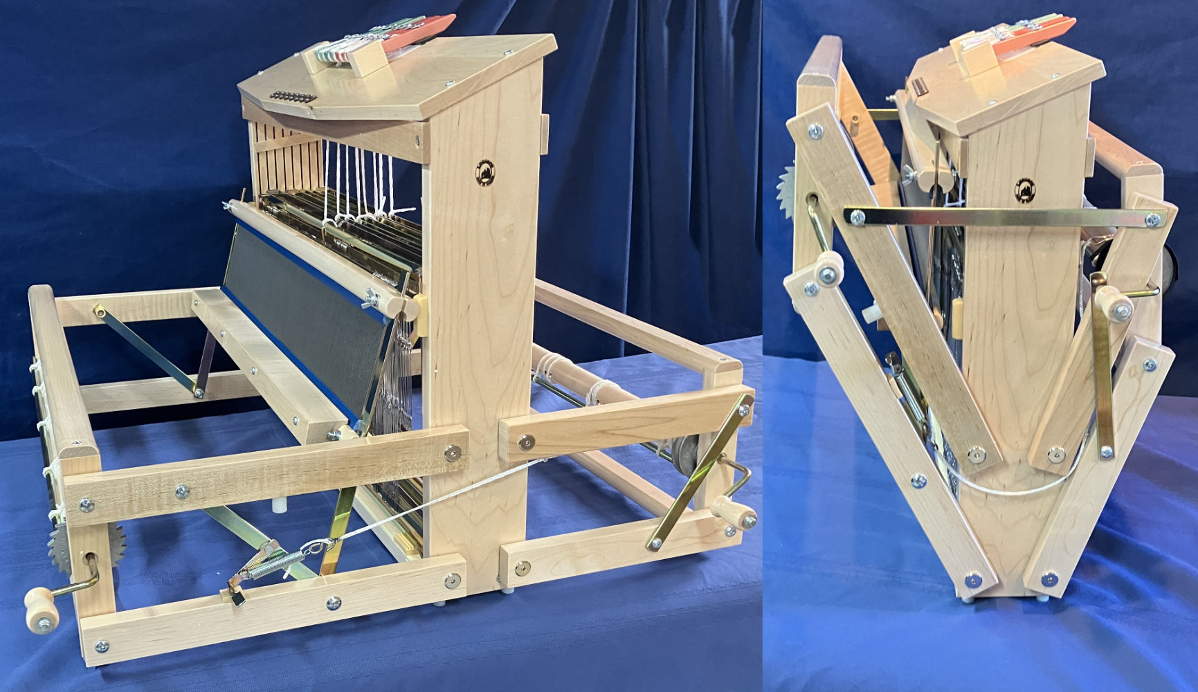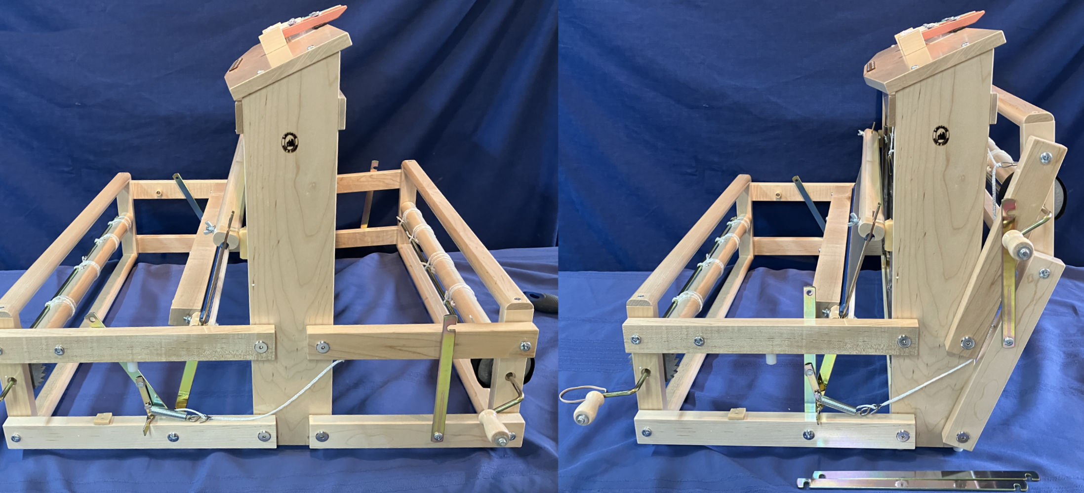 Both the front and back of Leclerc Voyageur weaving looms can be folded in to reduce the physical depth of the loom for storage or transport. The loom can be fully folded even while warped in the middle of a project.