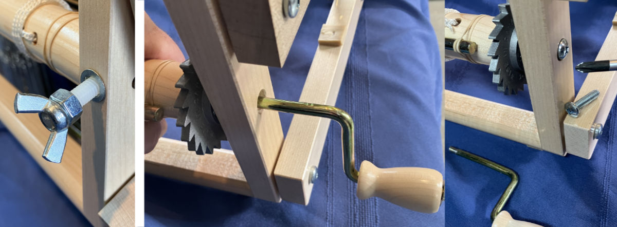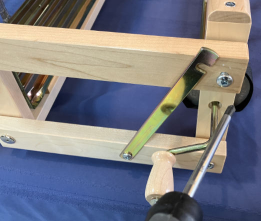 Because the Cloth and Warp Beam Crank Handles also stick out, they can be removed. Just grasp the wooden beam with one hand and rotate the crank handle counter-clockwise to unscrew the handle. Then, to keep the beam secure on the right side, install the screw that came with the loom where the crank handle was. Note that if the loom is just being folded for temporary storage and will be protected from physical damage, the crank handles can be left installed.
