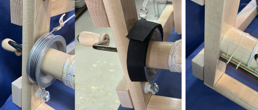 If there is no warp on the loom, and a pawl releases during the folding process, the warp rod and cords can unwind, so we loop an elastic around the beams at each end to keep them secure. If the loom is warped, advance the warp so the fell line is close to the front thread beam. If the warp needs to be released more to allow it to lengthen as it goes through the loom, it is easier to adjust it by turning the cloth beam while folding the loom.