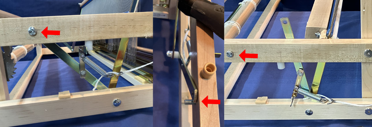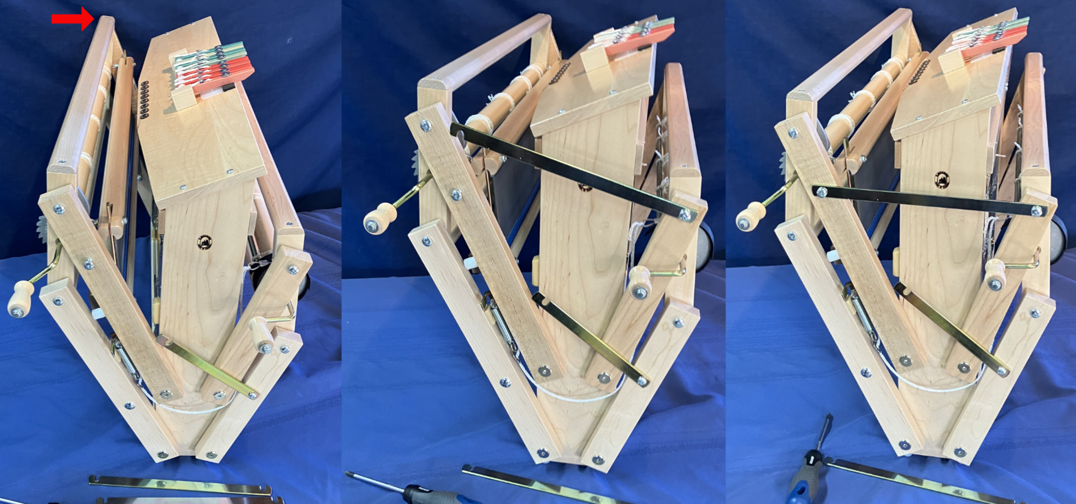 Because the front frame with the beater is heavier, it normally needs to be held up to stop it from dropping. If the loom is positioned beside a wall or solid object slightly diagonal with one of the front corners touching the wall when raised (where the red arrow points), it is easier to install the hooks without having to hold the front up.