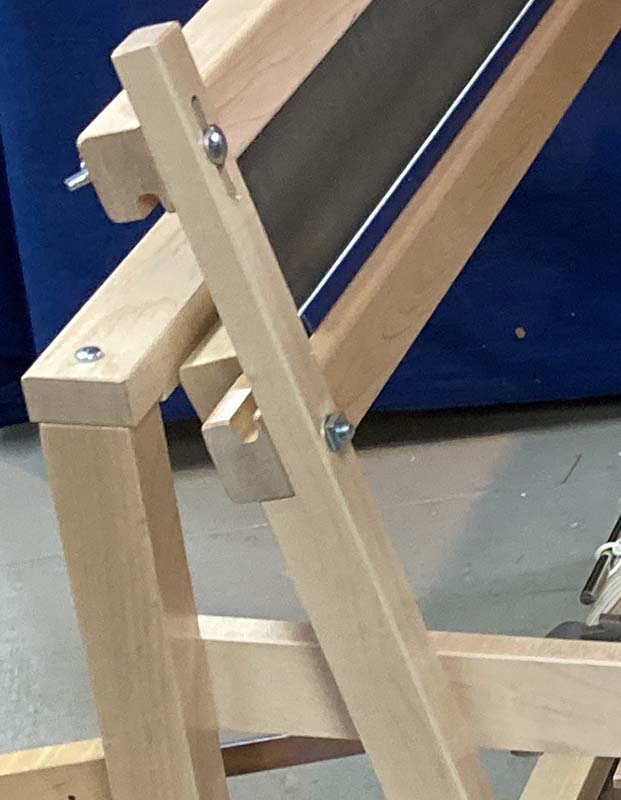 The treadle set is easily removable by loosening/removing two bolts at the weavers feet and disconnecting the cords. All this can be done while the loom is warped in the the middle of a project, making it easy to hide the loom away when not in use or for transporting or when it is to be moved through a doorway.