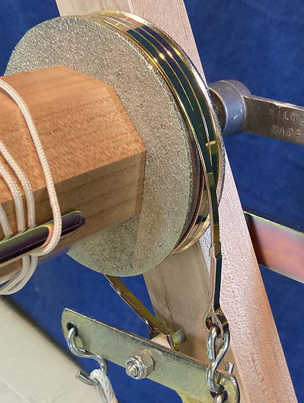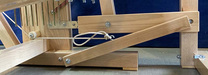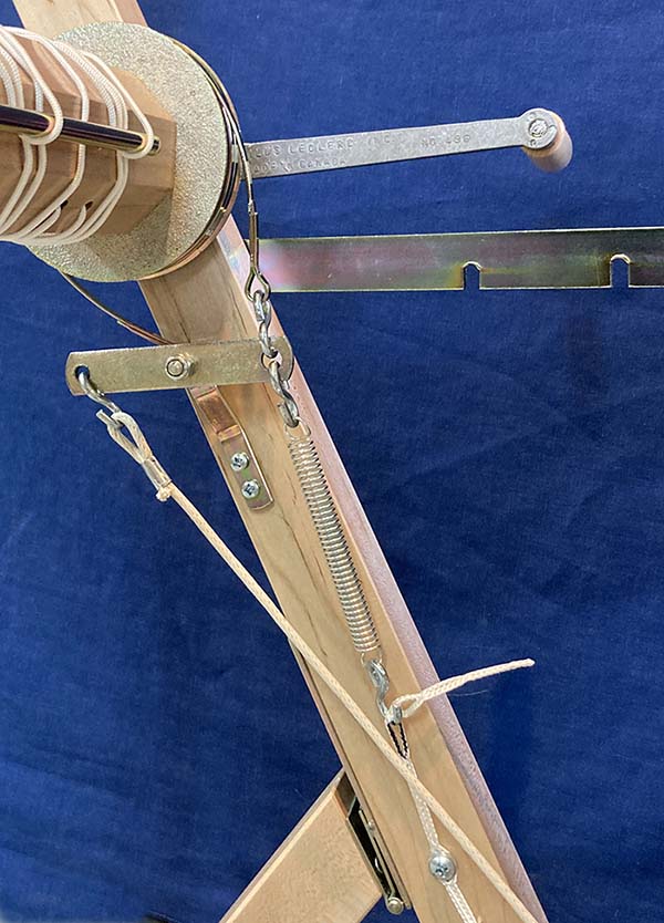 The Brake Spring holds the Brake Circle tight against the drum and the tension it applies can be adjusted by shortening or lengthening the cord it uses to attach to the loom frame. A small lever by the weavers left foot can be used to hold the brake treadle down with the brake released.