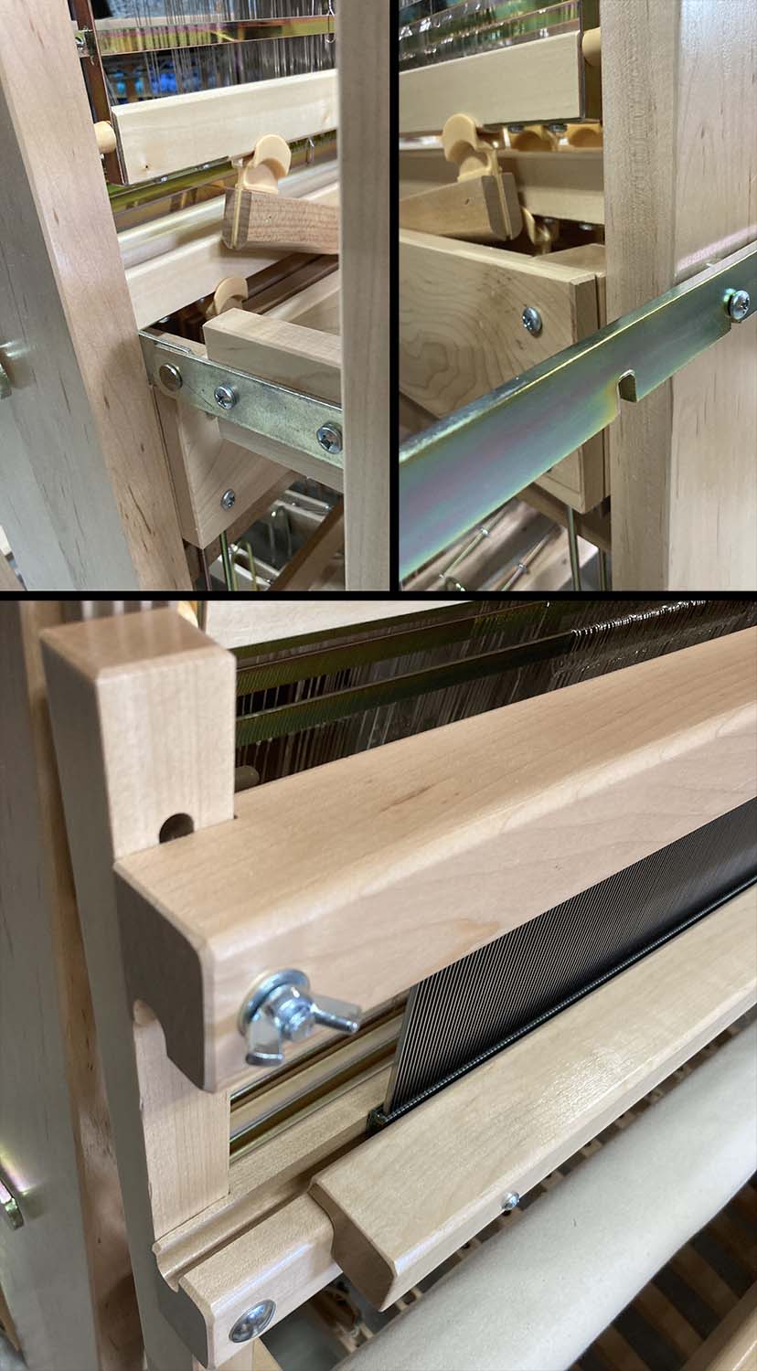 The reed for the Leclerc Artisat loom is installed in the Beater between two horizontal beams called the "Batten Handtree" and the "Batten Sley". These 1 3/4 inch square Maple beams hold the Reed securely in position by sitting below and pressing down from the top. The Upper Batten Handtree is fastened with wingnuts that when loosened allow it to be raised to remove or change the reed. The space for the reed is not blocked on either the right or left side so the weaver to use a reed that is longer (or shorter) than the one made for this loom width by letting the extra length stick out on either side. Because Leclerc offers a wide range of their own Carbon and Stainless Steel Reeds Artisat owners don't have to deal with the frustration of searching to find something to fit their loom.
