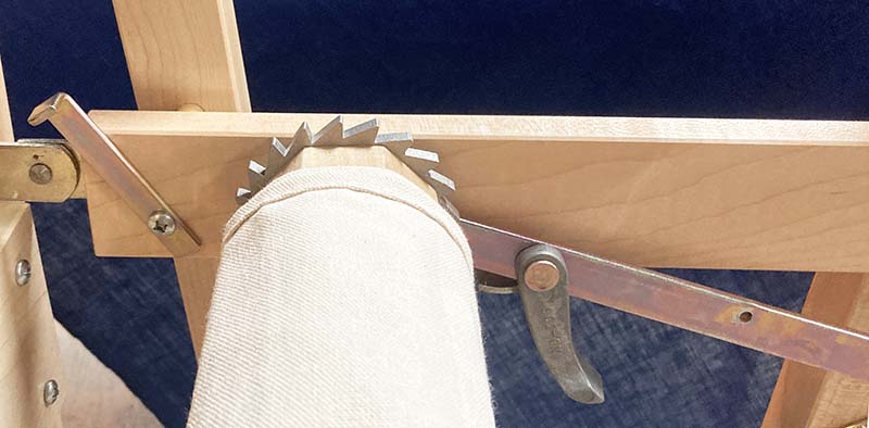 As well as increasing the strength by using metal, the weight of the pawl allows them to use gravity to lock in place. It also means that once a project is finished, the weaver can simple flip the two pawls up out of the way and unroll the fabric off the freely rotating cloth beam. |