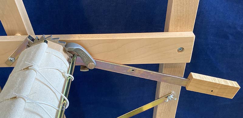 To advance the warp and move the fell line to the optimal position, a Take-up Motion Handle is located on the right side of the cloth beam, easily accessable to the weaver. A heavy duty metal pawl on the handle grips the ratchet wheel on the end of the cloth beam to rotate it and to wind the woven fabric onto the cloth beam. To lock the cloth beam in position while weaving a metal pawl attached to the loom frame stops the it from turning in the opposite direction. A wooden handle handle provides a comfortable grip and a metal bracket supports the handle in the horizontal position but does not interfere with raising the handle vertically out of the way when folding up the loom. The length of the handle provides the weaver with the leverage to easily tension the warp a few "clicks" at a time while allowing the warp beam to turn by putting their right foot on the brake treadle.