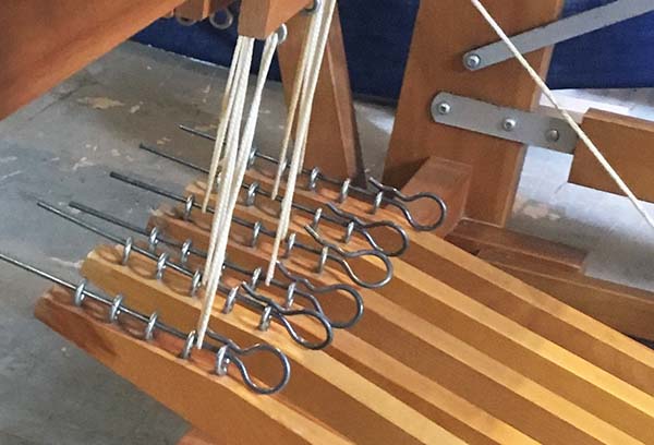 On the Artisat, the heddle support rods are attached to the shaft frame on either side using Shaft Frame Spring Clips. While Heddle Support Rods do flex, they are held rigid to the Shaft Frame while weaving using a pair of Heddle Support Bar Spring Hooks in the middle of the shaft frame at the top and bottom. During the threading process, releasing these hooks removes the tension from the heddles making them easy for the weaver to move side to side. The difference in tension on Texsolv heddles with and without the Spring Hooks engaged is demonstrated in this video.