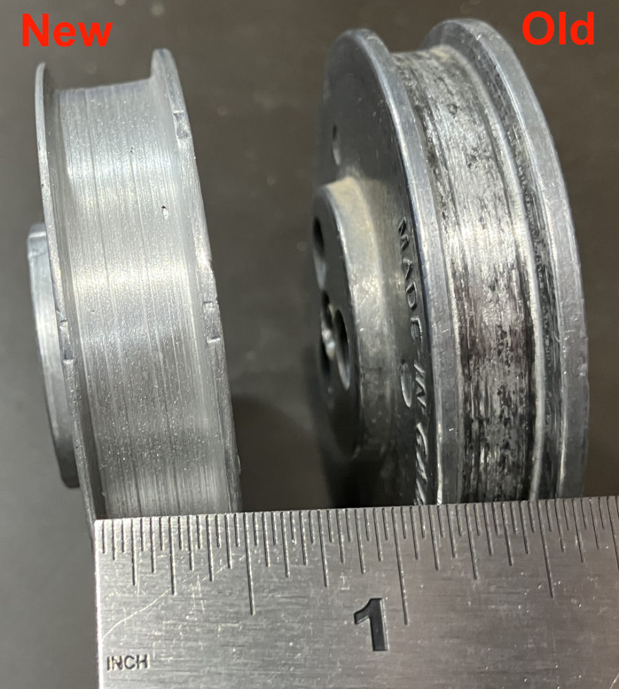 The Full Brake Upgrade Kit includes a replacement Brake Drum for the end of the Warp Beam. This newer style Brake drum privides a 7/16 inch gap for the cable while the older brake drums only had a 3/8 inch gap. The picture here shows the difference. The Partial Brake Upgrade Kit is used on looms that already have the newer Brake Drum.
