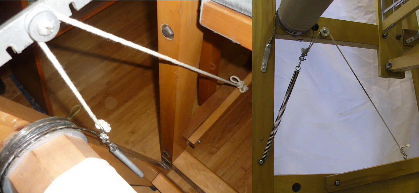 The new design on table looms is to use a section of Texsolv Loop Cord to connect the spring to the brake lever. This allows easy adjustment of the cord length to get the brake tension correct. A cord for 4 shaft looms is provided but if the loom has a longer frame for 8, 12 or 16 shafts a longer cord may be required.