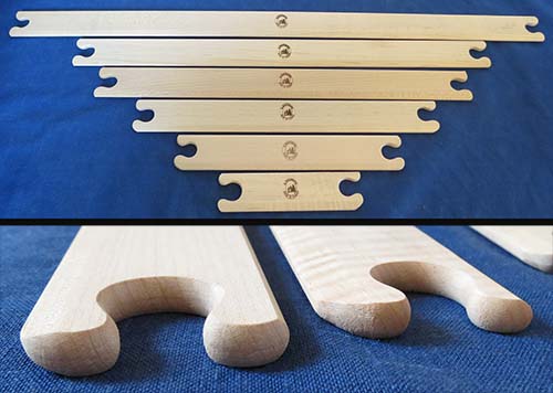 These Leclerc Flat Shuttles are used with heavy yarn, simple looms or when only a few rows of thread are required for colourwork. They are made of Maple and have a narrow knife shaped edge to allow them to beat the weft. Flat Shuttles are available in 7 lengths. (Click on picture to enlarge)