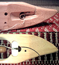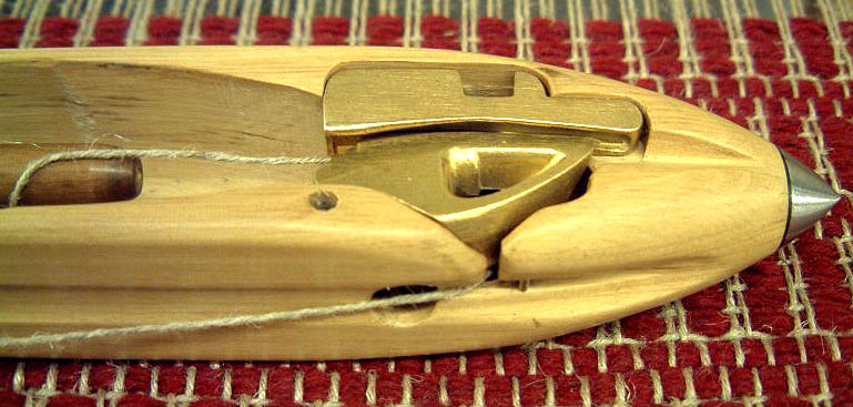 The yarn travels effortlessly off the end of the pirn through a guide and out the back of the shuttle through a steel wear guard. The guide also functions as an adjustable tensioning system allowing the weaver to set the perfect tension to match the yarn size and their personal preference. The wear guard extends the life of the shuttle long beyond those flying shuttles designed with a completely wooden guide. Unlike lower cost shuttles that require the weaver to thread the yarn around a maze of hooks, the Leclerc End Feed Shuttle can be threaded easily and effortlessly with no need to remember a complex threading pattern through the shuttle or put on your reading glasses to thread the yarn through a hole! The weaver simply grabs the yarn end and pulls it through a slot in the shuttle side.