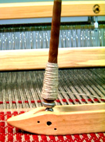 End Feed or "End Delivery" shuttles eliminate the drag on the weft that sometime occurs with shuttles that feed from the side. This results in a more uniform tension and removes the need for the weaver to adjust each weft shot to produce an even selvedge. Commonly found on industrial weaving equipment and flying shuttles, the yarn is wound on a pirn in the shuttle and flows easily off and out the back of the shuttle as it transverses the warp. The elimination of the need to spin a bobbin also reduces drag on the shuttle making it easier to throw.
