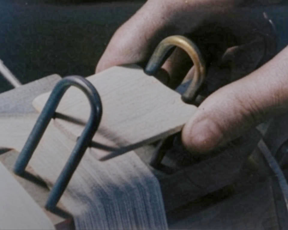 This handy device is used to lock the shafts of a Leclerc loom together to keep them from moving while the loom is being threaded. They are of most use with a counterbalance design. (Click picture below to enlarge)